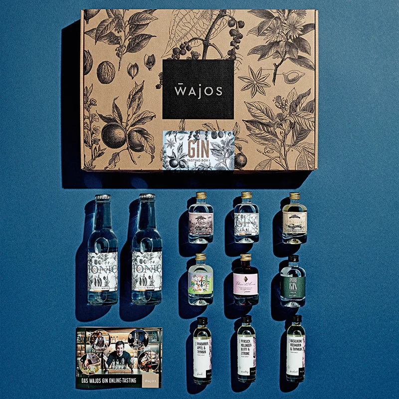 Sie mögen Gin, Gin Tonic und Cocktails? Dann werden Sie dieses Gin Set lieben! Das Geschenkset enthält fünf verschiedene Sorten Gin in kleinen Flaschen, darunter Klassiker sowie fruchtige Noten bis lokale Spezialitäten von der Mosel. Zudem umfasst das Tasting-Paket drei Mini-Flaschen Tonic Sirup und zwei Tonic Water. Ebenso liegt eine Cocktailliste, eine Einkaufsliste für weitere Zutaten und das für die Gin-Probe nötige Equipment bei. Denn viel mehr als nur ein Probierset ist diese Gin Box Ihre Eintrittskarte für ein besonderes Gin Tasting zuhause. Per Video führen Wajos Gründer Peter Oster und seine Gäste Nic Shanker, Autor und bekannt aus der Vox-Sendung „First Dates“ mit Roland Trettl, und Meister-Destillateur Hubertus Vallendar, durch den Abend. Der Link zum Video sowie der Zugangscode liegen der Tasting-Box bei.