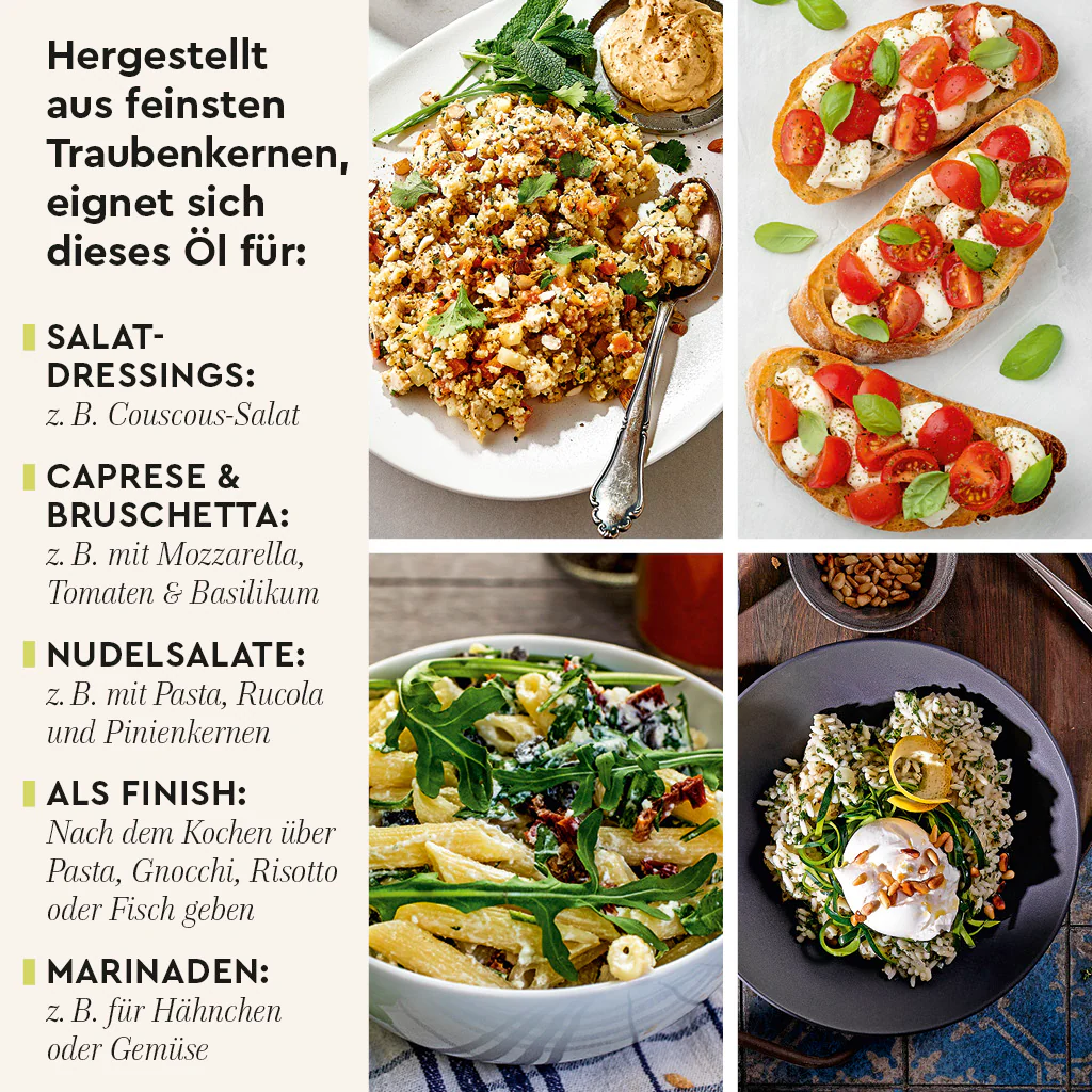 Entdecken Sie jetzt die mediterrane Frische von unserem Traubenkernöl mit Zitrone und Basilikum – und bringen Sie neue Leichtigkeit in Ihre Küche.